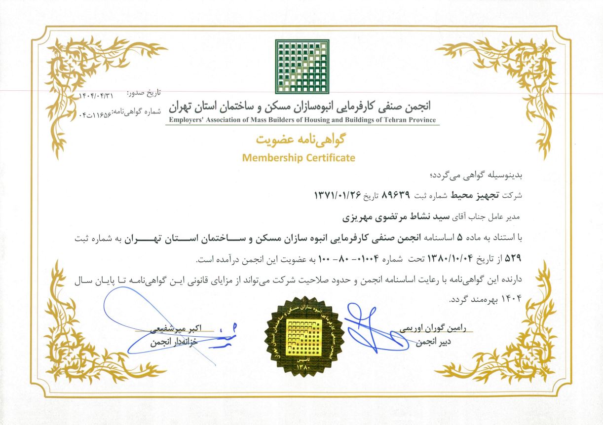 گواهی نامه انجمن کارفرمایی انبوه سازان مسکن و ساختمان استان تهران
