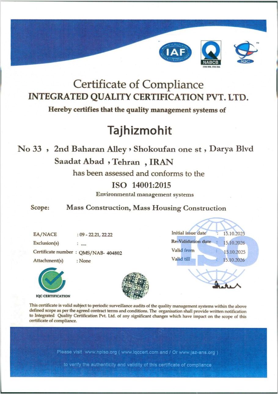 شرکت تجهیز محیط، به‌عنوان مجموعه‌ای پیشرو در حوزه پروژه‌های انبوه‌سازی، مشارکتی و زیربنایی، با رویکردی نظام‌مند و آینده‌نگر، متعهد به استقرار و بهبود مستمر سیستم مدیریت یکپارچه در راستای دستیابی به اهداف کلان سازمانی خود در حوزه‌های کیفیت، محیط زیست، ایمنی، بهداشت شغلی، و مسئولیت‌پذیری اجتماعی می‌باشد.