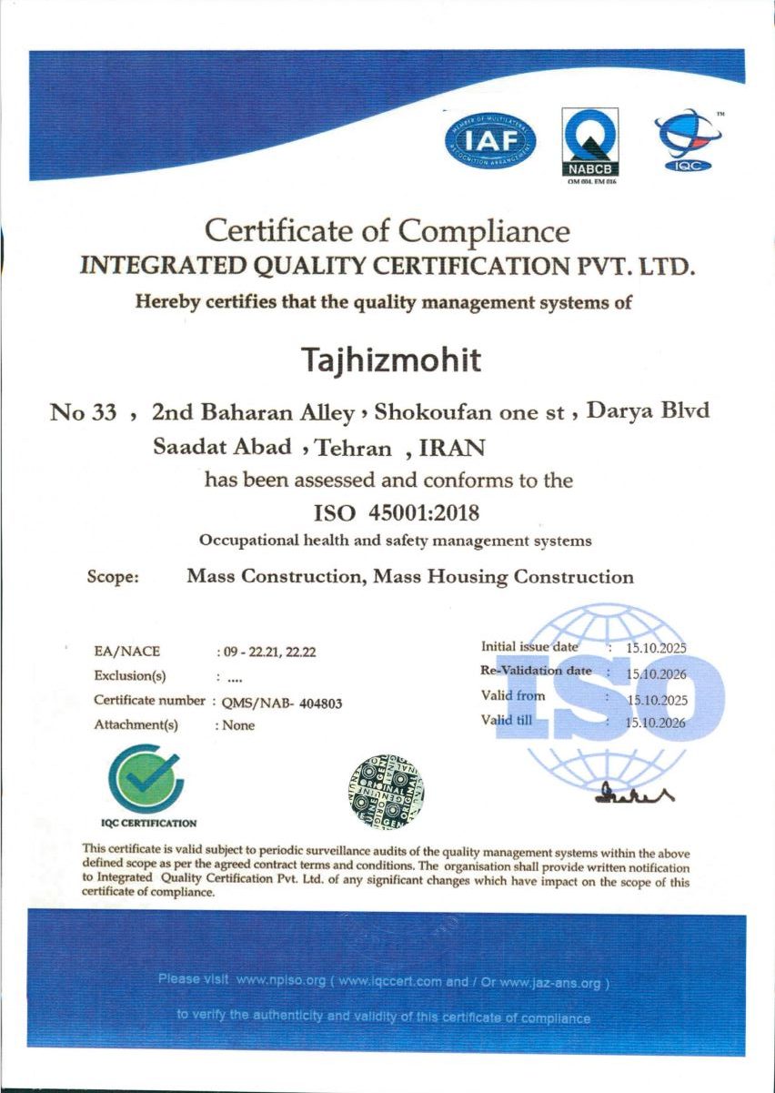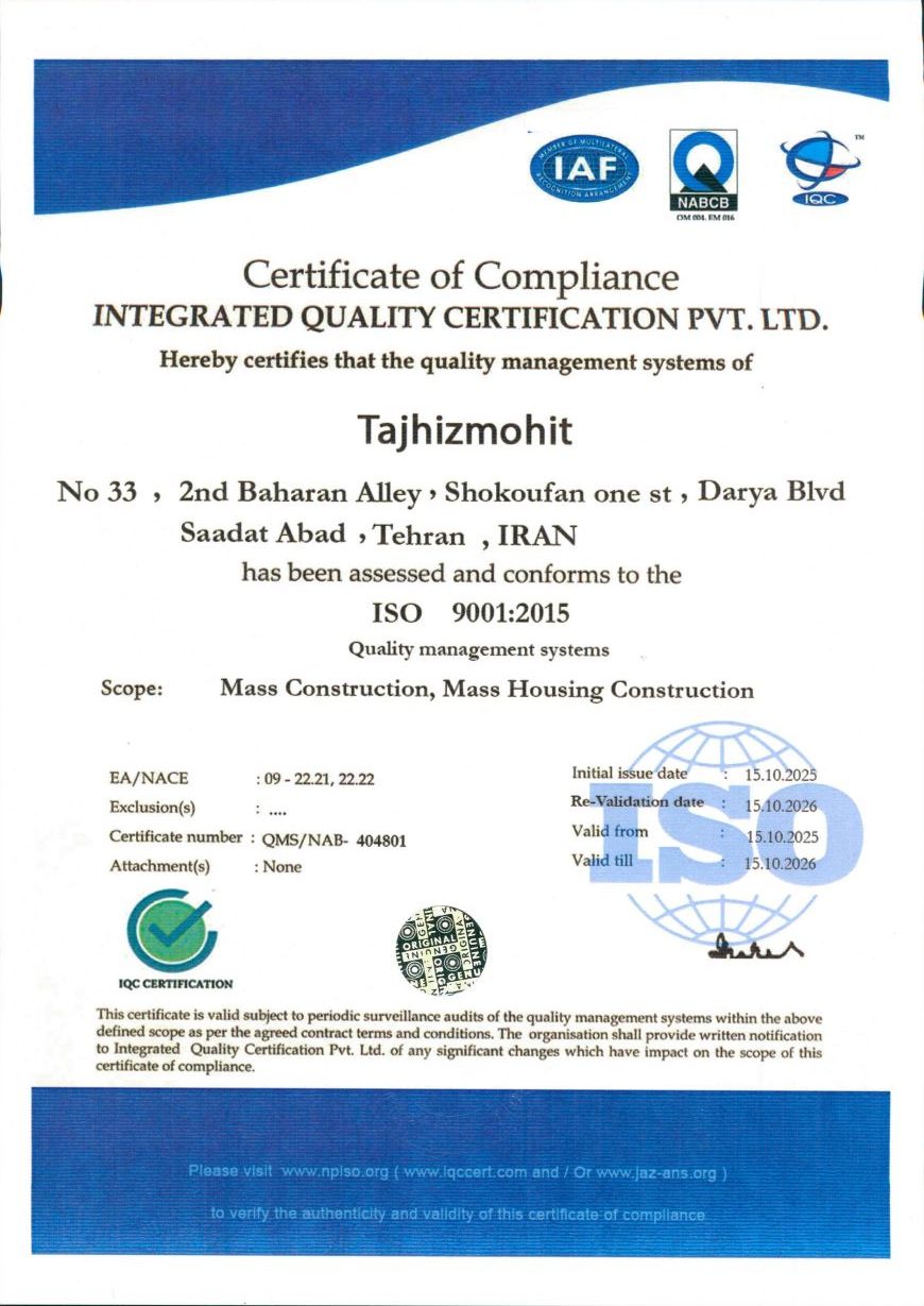 تمرکز بر تعالی سازمانی و ارتقای کیفیت منجر به دریافت گواهی تعهد به تعالی، گواهی انجمن کارفرمایی انبوه‌سازان، گواهی صلاحیت پیمانکاری و گواهینامه‌های بین‌المللی ISO 45001، ISO 9001 و ISO 14001 شد که نشان‌دهنده پایبندی شرکت به استانداردهای جهانی است.